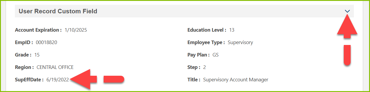 WHAT SHOULD YOU KNOW? 1. If a New Supervisor has not been assigned to the curriculum, please check (or ask someone on Teams to check) if the 'SupEffDate' field is populated with a date. You may need to click the 'User Record Custom Field' down-facing arrow to expand and show the information.