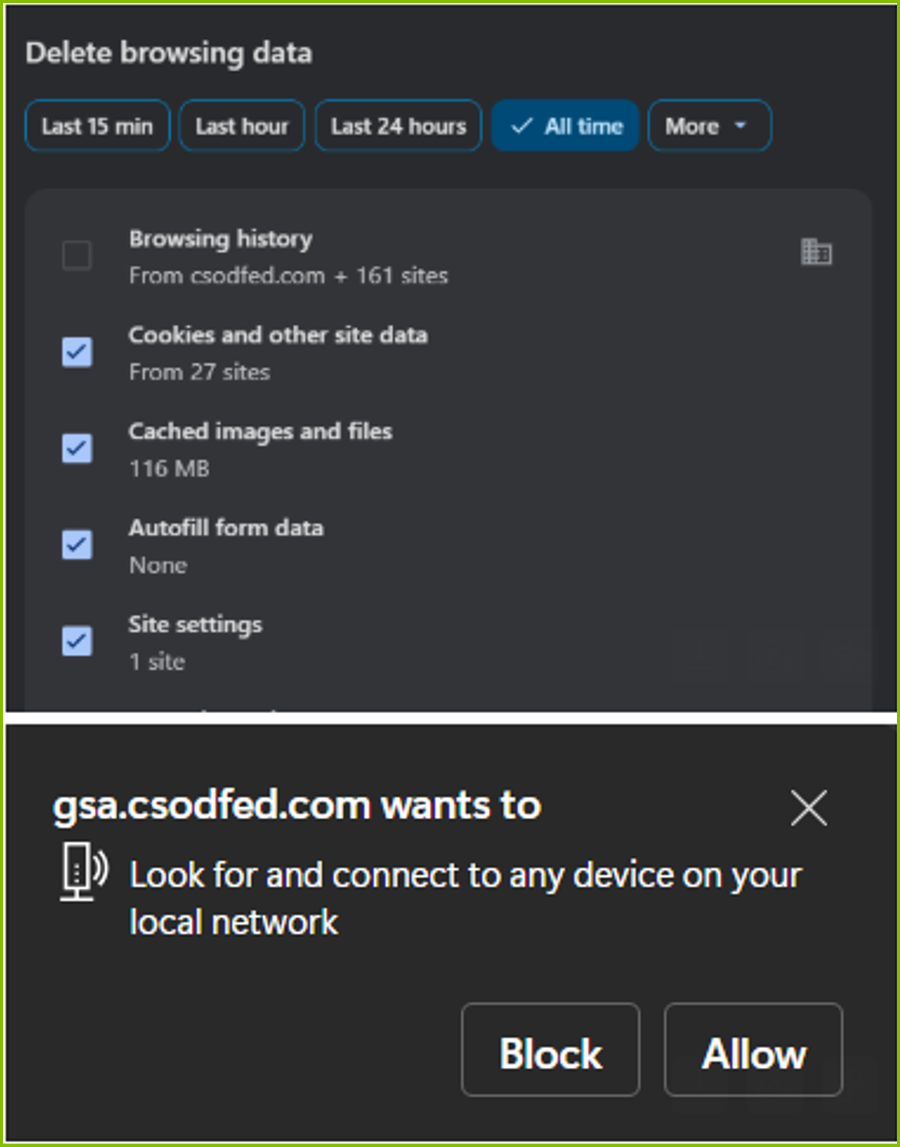 To resolve your issue, we advise clearing out the "Site Settings" (in Chrome) or "Site Permissions" (in Edge). When you refresh and return to the page, you should receive a prompt to Allow/Block access to the local network. Please select "Allow" for everything to display correctly.